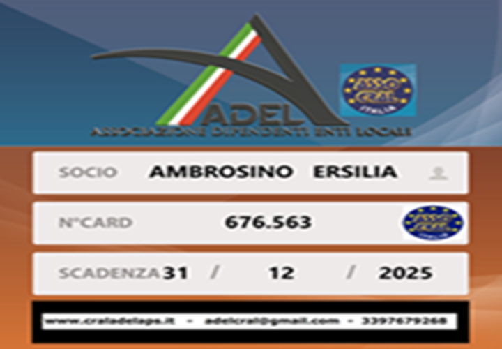 A.I.A.S Associazione Italiana Assistenza Svantaggiati Afragola NA A.S.D. Partenope Portici (NA) Accaparlante Cooperativa Sociale- Intercral Campania ACI Automobile Club Italia Napoli- Intercral Campania ACLI Provinciali di Napoli - Intercral Campania Agri Cral Italia -Intercral Campania Ass. Happy Holiday -NA - Intercral Campania Ass. Intercral Polizia - Intercral Campania Ass. Unione Naz. Mutilati sul servizio- Intercral Campania Ass.D.I.N.T.e.S.A. -NA - Intercral Campania Asso è Afragola - NA Assoc. G.S.C. "POSTE PORTO"NA- Intercral Campania Associazione " FAP ACLI " - Intercral Campania Associazione " Noi vittime del Consumo "- Intercral Campania Associazione " O Core 'e Napule" Intercral Campania Associazione A.L.P.I. Intercral Campania Associazione Agapè Onlus Associazione ALTHEA E.T.S. - Cellole (CE) Associazione ASSOFAMILY - Cercola (NA) Associazione AVIS Comprensorio NA 4 Casalnuovo (NA) Associazione Cral Enac - Intercral Campania Associazione CRES - Aversa (CE) Associazione CTA Aversa (CE) Associazione Culturale " Napoli è " - Intercral Campania Associazione Culturale NAPOLARTE (NA) Associazione Fita Campania - Intercral Campania Associazione Il Gabbiano - Intercral Campania Associazione Ispanico Missione Aiuto- Intercral Campania Associazione La Rinascita - intercral Campania Associazione Lo Scudo - Intercral Campania Associazione Maestri del Lavoro - Intercral Campania Associazione MDC Sannio Valletelesina Benevento Associazione Megaris Na -Intercral Campania Associazione Mondo Scuola - Intercral Campania Associazione Nuova Holiday Onlus NAPOLI ASSOCIAZIONE ONULS CRAL P.P. Napoli Associazione Polisportiva Partenope NA Assocooperative Associazione Cooperative Italiane CE Assopensionati - Associazione Pensionati Autonomi - NA Assostato Na -Intercral Campania CALT Centro Assistenza Lotta Tumori NAPOLI CIRCOLO DEL GASTRONAUTA Napoli Circolo Dipendenti Comune di Avellino AV Circolo Ospedaliero OORR Comsi Salerno Comune di Pompei NA Cral Ansaldo STS - Napoli Cral Jabil Italia - ex Marconi - Marcianise (CE) Cral Vita 2001 - Pignataro Maggiore (CE) CRAL A. De Nicola ASL Salerno 1° (SA) Cral A.D.E.L. Associazione Dip. Enti Locali Napoli Cral Agenzia Dogane e Monopoli Campania e Calabria (NA) Cral Amm. Provinciale Benevento Cral ASMEL - Napoli Cral Autorità Portuale Na Cral Avis Caserta Cral Banca di Credito Popolare - Intercral Campania Cral BCC di Scafati e Cetara Scafati (SA) Cral Beni Culturali Napoli Cral C.S.A. Metzeler Battipaglia (SA) Cral Campania Felix NA Cral CapuaBioservices - Capua (CE) Cral Carlo La Catena Vigili del Fuoco Onlus NA Cral Circumvesuviana - Napoli Cral Comune di Marano di Napoli NA Cral Comune di Napoli Cral Intercomune NA- CE - Napoli Cral Comunicazione - Intercral Campania Cral Dipendenti Giustizia Salerno Cral Dipendenti Sanità Campana - NA Cral EMM Informatica- Intercral Campania Cral ENEA Portici (NA) Cral ex U.S.L. n.16 Maddaloni S.Felice (CE) Cral F.O.S. Battipaglia (SA) Cral FORMEZ Pozzuoli (NA) Cral Funny Days - Napoli Cral Giustizia 2000 Na - Intercral Campania Cral Gori Pompei (NA) CRAL IL FUTURO Napoli Cral Il Mattino NA Cral Imp. Depurazione Napoli Est - TM.E Spa (NA) Cral INPS Caserta Cral Inps Napoli - Intercral Campania Cral INPS Soccavo - Intercral Campania Cral Magnaghi Aeronautica - Intercral Campania Cral Number One (Osp.Cotugno-Monaldi-CTO) -Intercral Campania Cral Orizzonti 2000 Napoli Cral Ospedale A. Cardarelli NAPOLI Cral Ospedale Maresca Torre del Greco (NA) Cral Ospedale Monaldi Napoli Cral Ospedale SAN GIUSEPPE MOSCATI - CE Cral Parthenope -Università Parthenope - Napoli Cral Pierrel Farmaceutici - Intercral Campania CRAL Polizia di Stato Italia NAPOLI CRAL POLIZIA PENITENZIARIA CAMPANIA Pomigliano D'Arco (NA) Cral polizia Penitenziaria di Poggio Reale Cral Polpen - Intercral Campania Cral Pompieri di Napoli Cral Questura di Napoli NA Cral S.P.Q.C. Officine mecc. Aerospaziali CAPUA Cral Selenia Fusaro - Bacoli (NA) Cral Settore Telecomunicazioni Pozzuoli (NA) Cral Sigaro Toscano - Cava de' Tirreni (SA) Cral Tangenziale di Napoli - NA Cral Umberto 1° ASL Salerno 1 Nocera Inferiore (SA) Cral Università Luigi Vanvitelli - Intercral Campania CRAL Università degli Studi di Salerno Dip. Comune di Afragola (Na) Intercral Campania Dip. Comune di Torre del Greco (Na)Intercral Campania Euro Tour Cral- Scuola e Societò - Napoli F.A.B.I. Monte Paschi Siena Salerno F.I.L.D.A Federazione Sindacale Lavoratori Pubblici - Aversa -CE FEDAPI Federazione Italiana Biotecnologi F.I.Bio Napoli Federcons Federazione Consumatori NA Federcral Italia - Cercola (NA) FENALCA International Sindacato Pensionati - NA Fondazione Casa dello Scugnizzo- Intercral Campania G.O.P.I. Gruppo Operativo Primo Intervento Caggiano (SA) GESCO-Gruppo Imprese Sociali- Intercral Campania Ikcral Campania - S.Marcellino (CE) Intercral Campania - NA Movimento Unitario Giornalisti - Intercral Campania Noi Cral - Intercral Campania Opti Cral Napoli Sporting Center Sant'Anastasia NA SUGC -Sindacato Unitario Giornalisti della Campania (NA) Tirrenia di Navigazione spa NA Unione Naz.le fra i Pensionati del Banco di Napoli -NA | ||