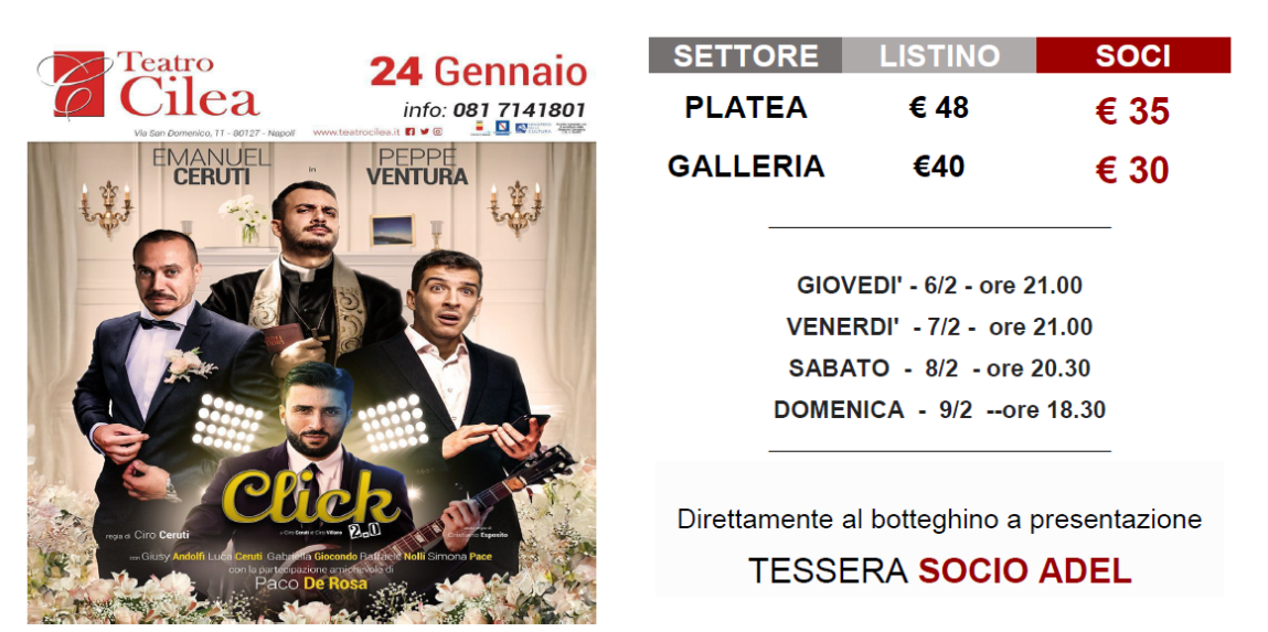 Direttamente al botteghino a presentazione TESSERA SOCIO ADEL Prenotazioni presso ADEL al 339 767 92 68 | ||||